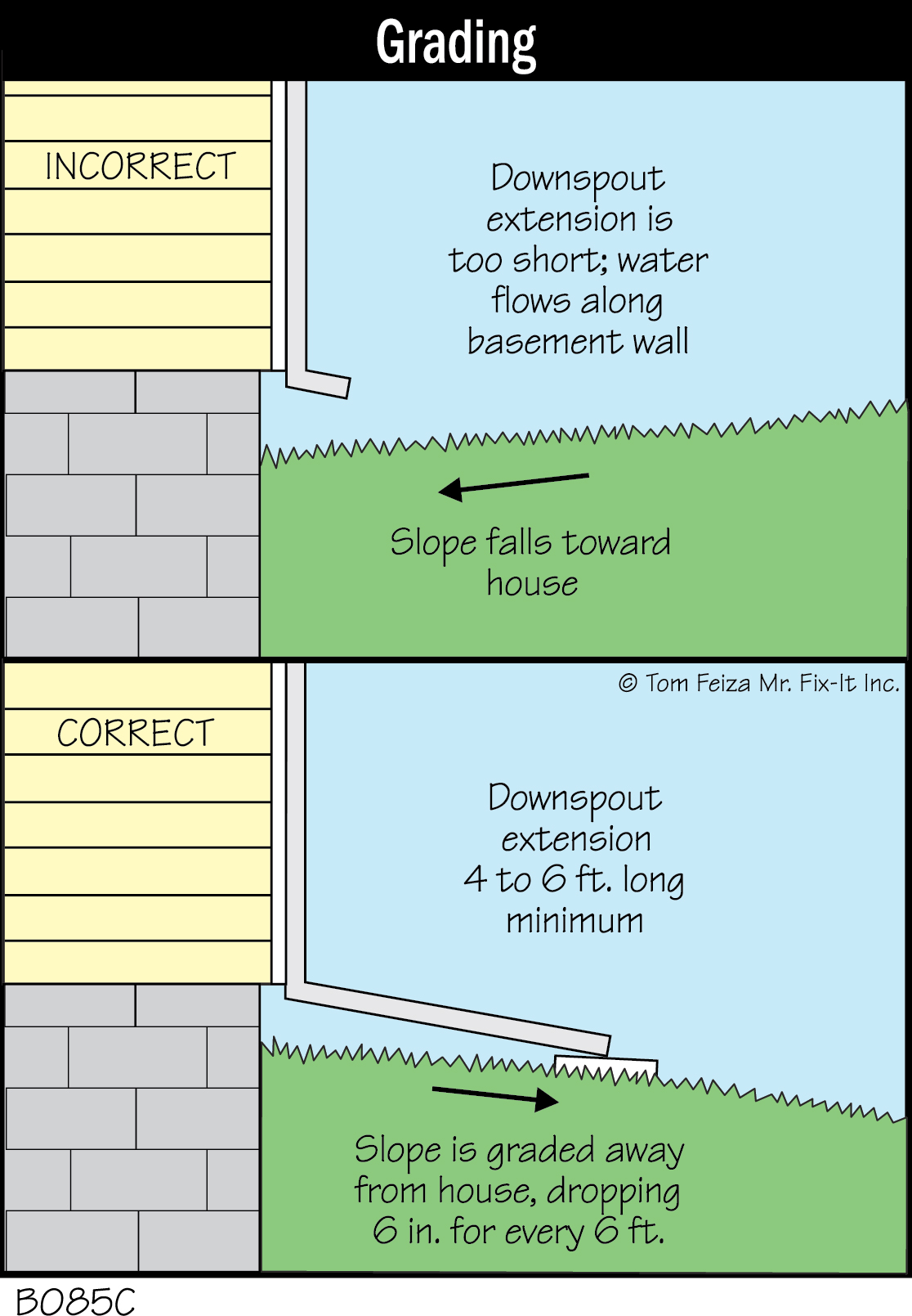 Proper grading around the house is your best protection against seepage into the basement that may cause expensive damage. When a home is built, workers dig the excavation several feet larger than the basement walls to allow for construction clearances.